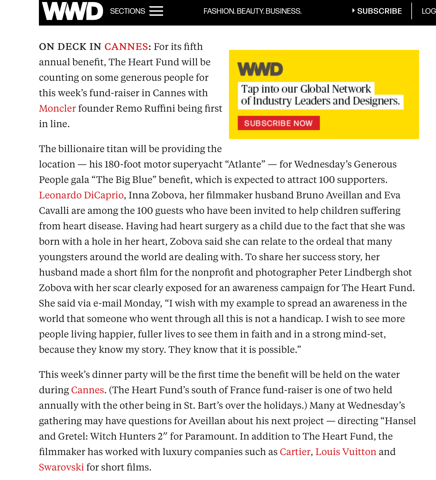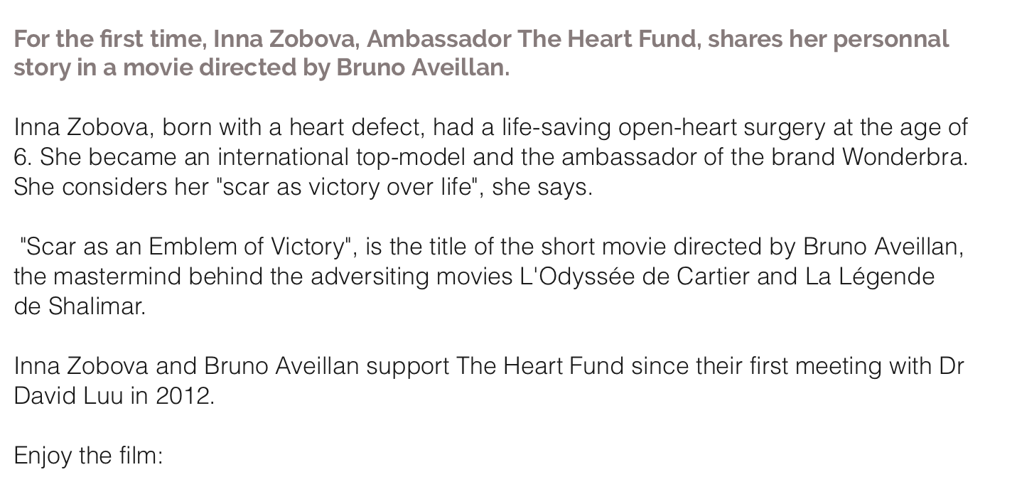 For the first time, as an Ambassador of The Heart Fund, I would like to share with you my personal story presented as a short film.I was born with a heart defect and had a life saving open - heart surgery at the age of 6. This big scar that i have is for me, a symbol of victory of Life over Death. I warmly thank Mr. B. Aveillan for putting my life into the short film and Mr. Peter Lindbergh for photographing it. I truly believe in an importance of raising an awareness of cardio-vascular diseases. I also hope, that this film will bring hope to those people who went under a heart surgery to live their life fully. Best, Inna.